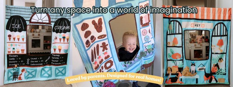 The Cozy Cube creates imaginative play panels for kids that turn everyday spaces into cafés, markets and role-play worlds. Designed for play couches, doorways or even your dining table, our screen-free panels are perfect for creative pretend play at home and easy pack-away fun.